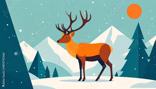Cartoon deer with antlers in snowy, stylized mountain landscape, blue sky, pine trees, and an orange sun