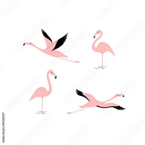 Cartoon flamingo icon set. Cute bird in different poses. Illustration for prints, clothing, packaging, stickers.