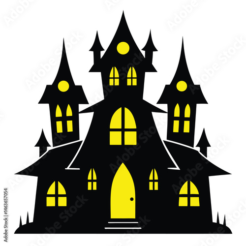 Cartoon Haunted House with Yellow Windows and Twisted Architecture Isolated on White Background
