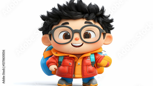 Cartoon Illustration of a Cheerful Boy with Glasses and Backpack in Red Jacket on White Background