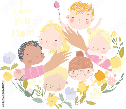 Cartoon Mother s Hands hugging Children in Floral Wreath. Vector illustration