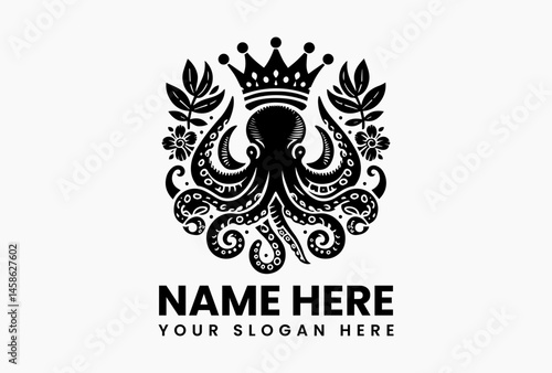 Cartoon octopus with crown surrounded by floral and leafy elements in symmetrical black and white vector design, symbolizing marine royalty and underwater charm