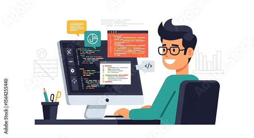 Cartoon of a programmer working on a computer with code and charts displayed on the screen