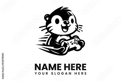 Cartoon otter playing video games with a controller, depicted in black and white.