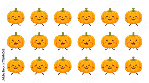 Cartoon Pumpkin Line Dance. Vector-style set of 12 pumpkins in a row doing synchronized dance moves (left step, right step, clap, twist). Bright flat colors, minimal background, smooth outline...