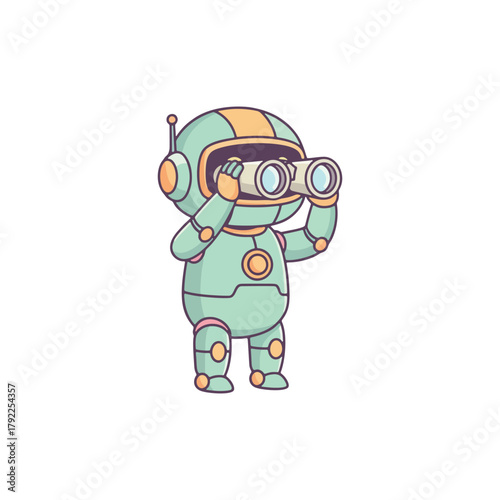 Cartoon Robot Character Looking Through Binoculars.