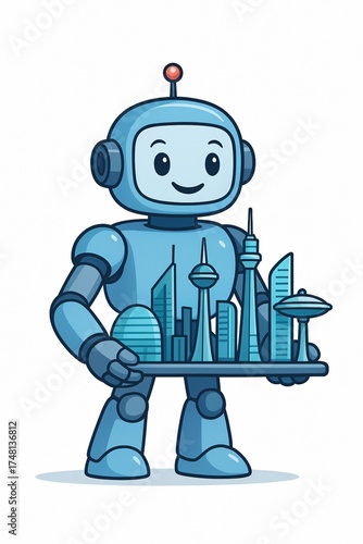 Cartoon robot holding a futuristic city on a tray, isolated on a white background