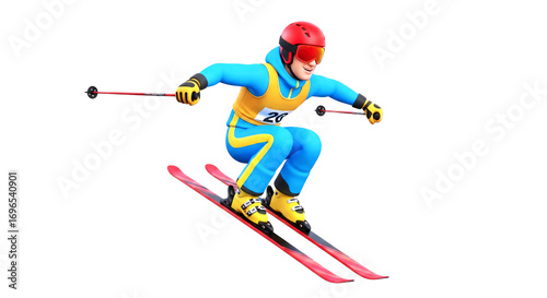 cartoon ski racer thrilling downhill, dynamic pose, winter sports fun, isolated on transparent background