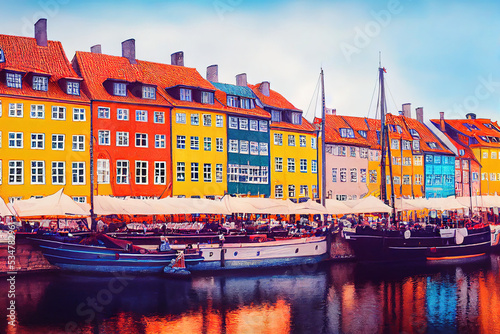 Cartoon style Panorama of north side of Nyhavn with colorful facades of old houses and old ships in the Old Town of Copenhagen capital of Denmark , Anime style