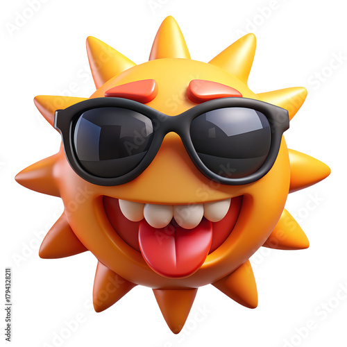 Cartoon sun character wearing sunglasses and sticking out tongue