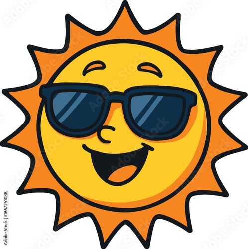 Cartoon sun wearing sunglasses smiling with open mouth happy