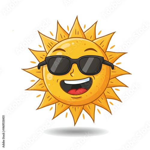 Cartoon sun with sunglasses smiling brightly on a white background with a small shadow below it