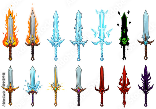 Cartoon swords collection twelve designs various colors elemental themes unique handles stylized art digital illustration