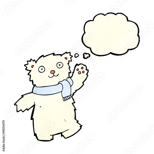 cartoon teddy bear wearing scarf with thought bubble