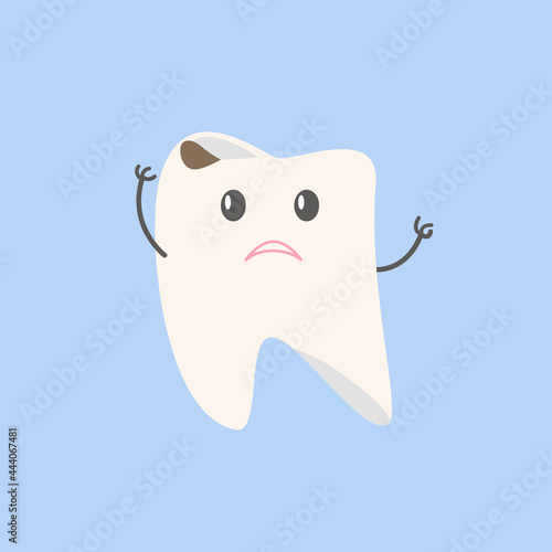 Cartoon tooth with caries on a blue background. Sad little man. Vector graphics.