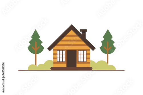 Cartoon-style vector of a cozy wooden cabin in a serene landscape, ideal for branding and decor.