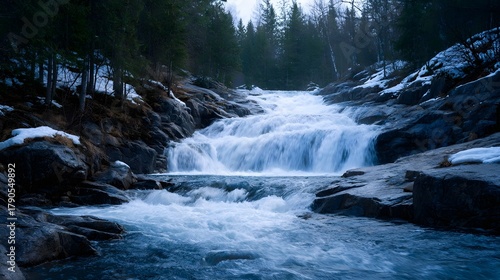 Cascading waterfall in a serene winter forest with snow dusted rocks and flowing white water
