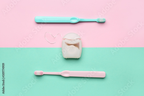 Case with dental floss and toothbrushes on colorful background