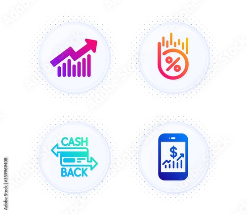 Cashback card, Loan percent and Demand curve icons simple set. Button with halftone dots. Mobile finance sign. Money payment, Discount, Statistical report. Phone accounting. Finance set. Vector