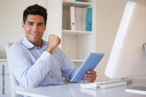 Casual businessman holding his tablet at his desk