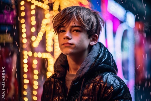 Casual fashion portrait photography of a tender mature boy wearing a cozy winter coat against a neon sign background. With generative AI technology