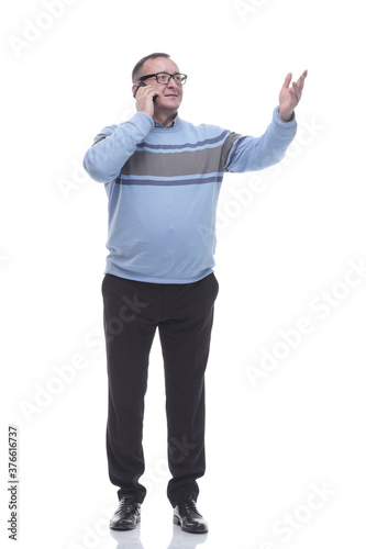 casual mature man with smartphone looking at copy-space.