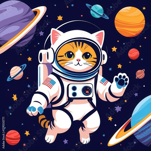 Cat Astronaut floats in Dark Blue Space. Orange Cat wears white space suit with flag. Planets and Stars around cute cartoon kitty.