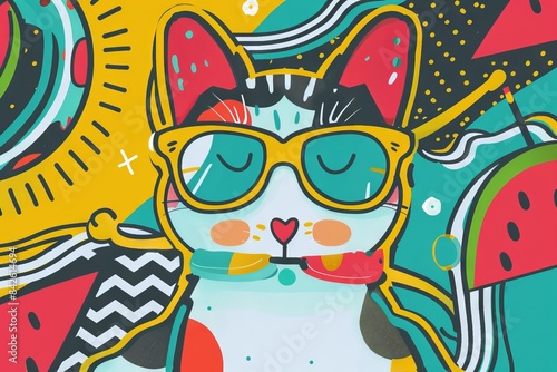 cat in yellow sunglasses, pop art illustration on a background of bright abstract elements: watermelon, sun, wavy and zigzag lines Concept: summer mood, modern design, cheerful and bright drawings