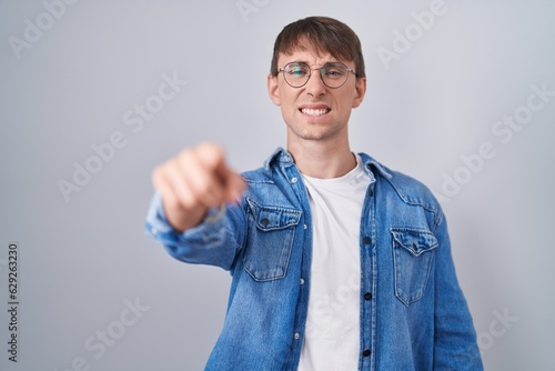 Caucasian blond man standing wearing glasses pointing displeased and frustrated to the camera, angry and furious with you