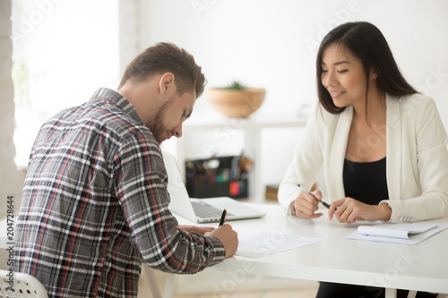 Caucasian businessman signing contract buying business insurance or taking loan at meeting with asian hr businesswoman, successful job candidate puts signature on employment agreement, hiring concept