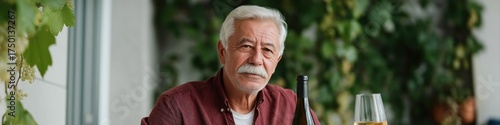 Caucasian elderly male enjoying wine outdoors in vineyard setting