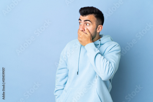 Caucasian man over isolated blue background doing surprise gesture while looking to the side