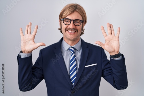 Caucasian man with mustache wearing business clothes showing and pointing up with fingers number ten while smiling confident and happy.