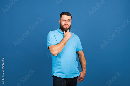 Caucasian man's portrait isolated on blue studio background with copyspace