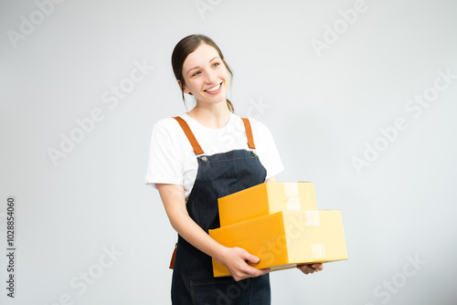 Caucasian woman smiling and holding package parcel box isolated on white background