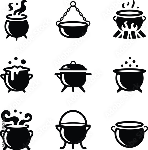 Cauldron Icon Set – Witch Pot, Magic Brew, and Halloween Symbol Collection Boiling Cauldron Icons – Spooky Halloween and Witchcraft Pot Silhouette Set