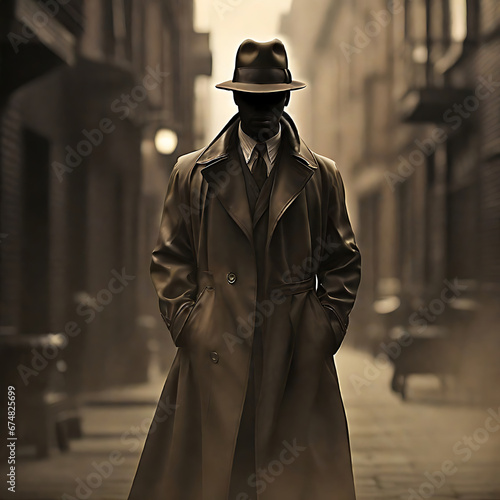 Cautious detective in a sepia-toned, vintage photograph wearing a trench coat.Generative Ai