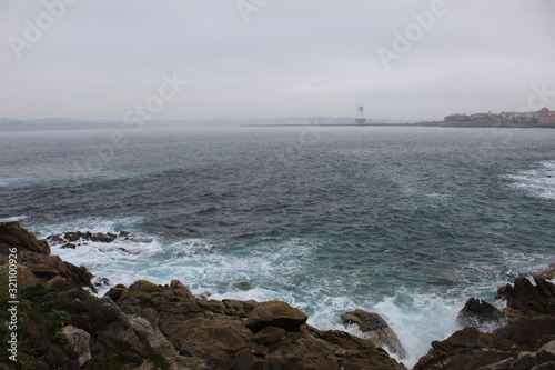 CCliffs, waves and fog in Atlantic Ocean near A coruna.
