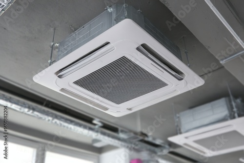 Ceiling mounted cassette type air conditioning unit in modern indoor space providing efficient cooling during summer heat