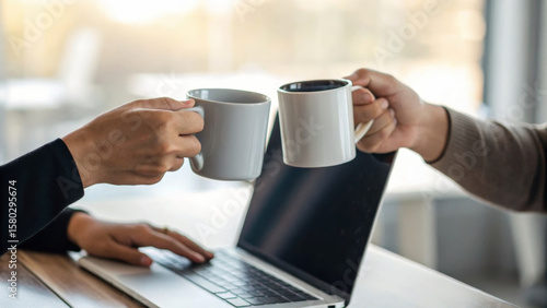 Celebrate business success happy party at office. Two people clinking white coffee mugs over laptop, celebrating business success at office. Team corporate,achievement group victory,winning