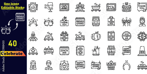 Celebrate stroke icon collection, featuring icons such as a bouquet of flowers, karaoke, DJ, masquerade, and more. Editable outline icon set.