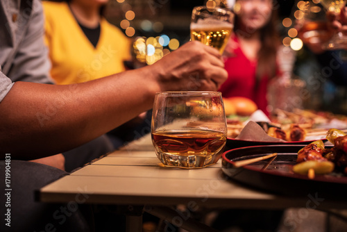 Celebrate whisky at an intimate party at a camping restaurant. group celebration.