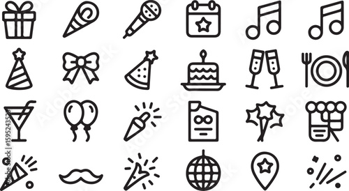Celebration icons gift party hat microphone music notes cake champagne vector