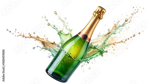 Celebratory champagne bottle with dynamic liquid burst on pristine background