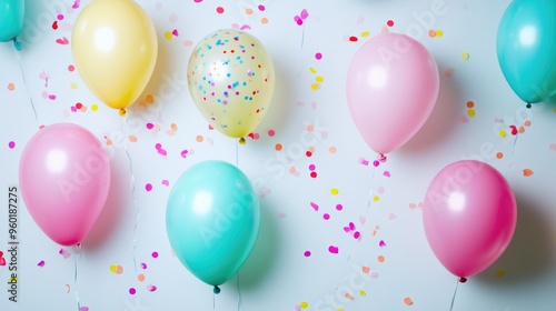 Celebratory Foil Balloons with Confetti on Clean White Background