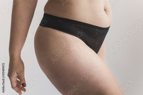 Cellulite and stretch marks in a woman on her thighs close-up on a gray background. Girl in black shorts without a face close-up