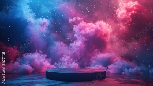 Centered on a reflective surface, a solid black platform awaits. Overhead, billows of purple and pink clouds swirl.