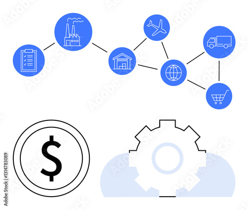 Chain of supply icons including factory, airplane, warehouse, truck, cart, and dollar sign with gear symbol. Ideal for logistics, manufacturing, economy production cycle trade planning flat