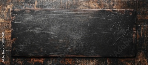 Chalkboard on rustic wooden background with visible chalk marks and ample copyspace for text placement in top view composition