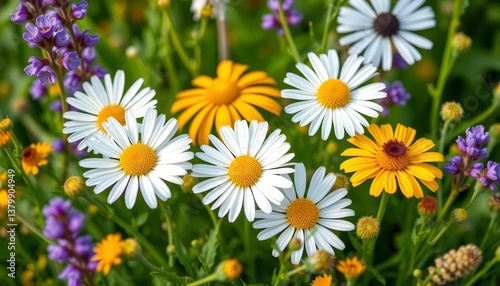 Chamomile & calendula blossoms encircle assorted hair-beneficial herbs, wellness, alternative